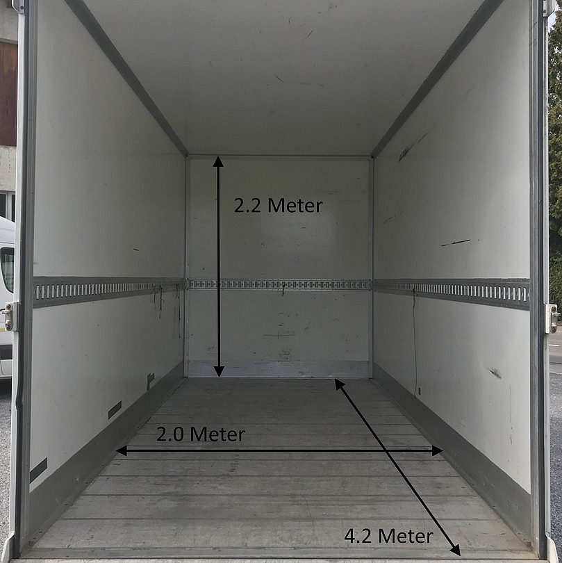 Innenmasse: Länge: 4.20 Meter, Breite: 2.0 Meter, Höhe: 2.2 Meter